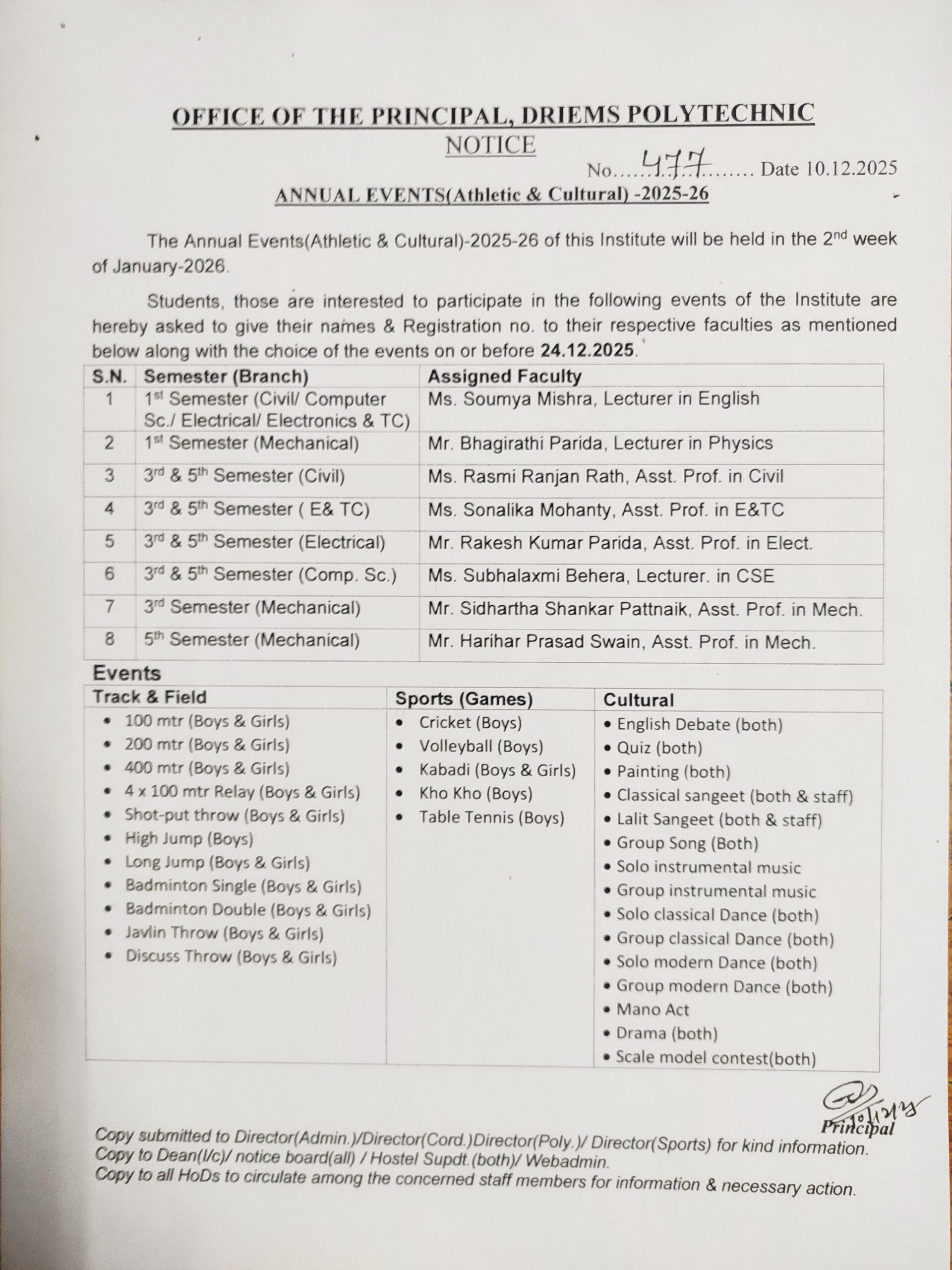 News and Events | Notice | Upcoming Events Announcement: Annual Athletic & Cultural Events 2025–26 ByDRIEMS Polytechnic December 10, 2025December 13, 2025