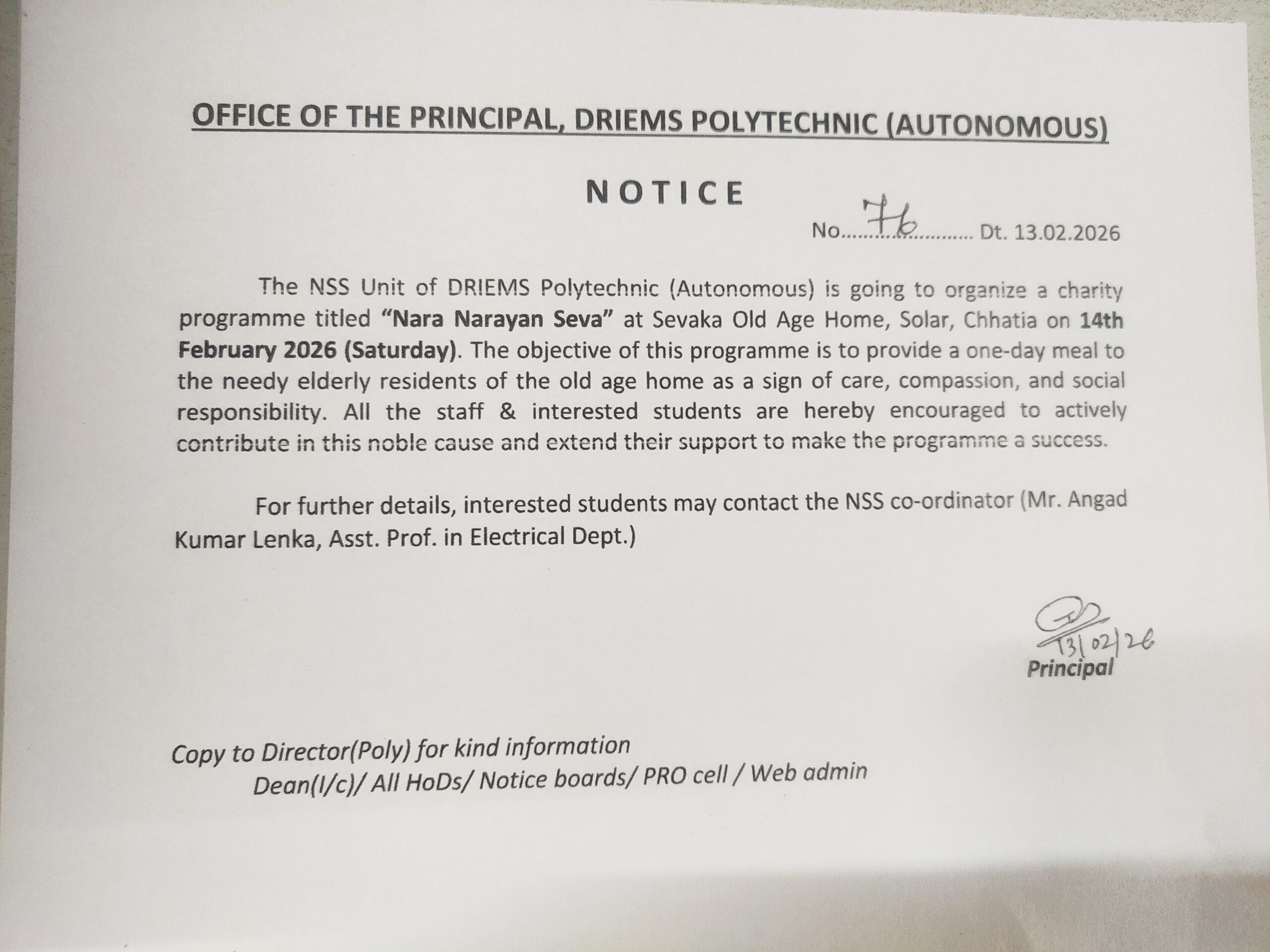 Notice | Upcoming Events NSS Charity Programme “Nara Narayan Seva” at Sevaka Old Age Home (14 February 2026) ByDRIEMS Polytechnic February 13, 2026February 17, 2026