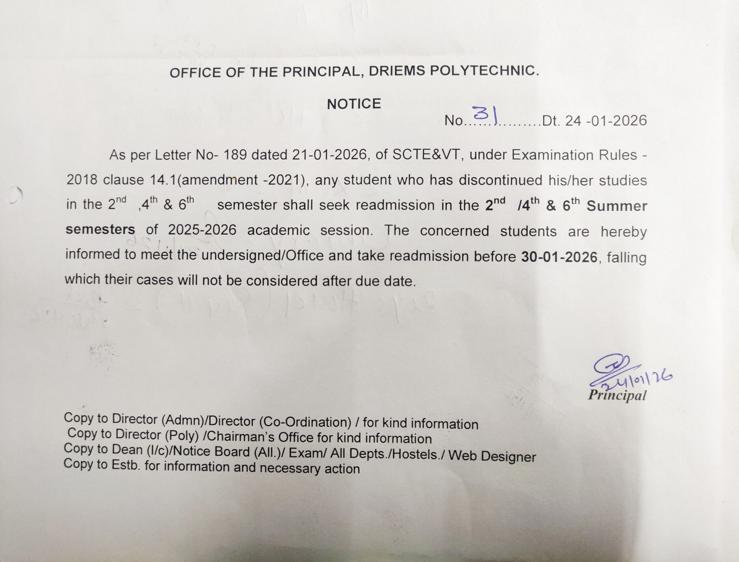 Notice Programme for BPT,BOT 6th & 4th semester Examination-2025 ByDRIEMS Polytechnic January 24, 2026